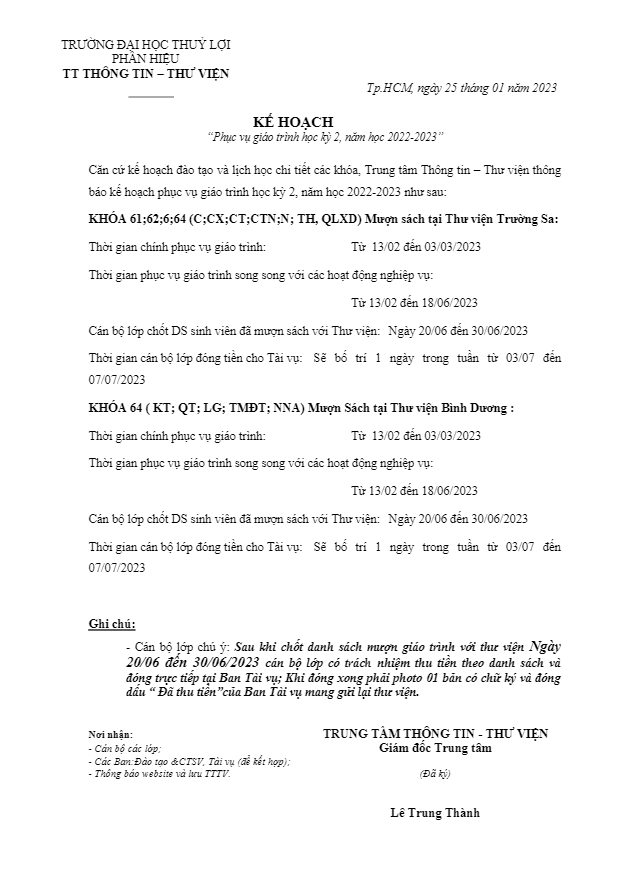 Hoạt động Thư việnKế hoạch phục vụ giáo trình HK2 2022-2023 Đăng vào 03/04/202319/07/2024 bởi Lê Trung Thành 03 Th4 Lê Trung Thành Thông báo về tài khoản thư viện số cho Tân sinh viên khóa 64 Thông báo Chương trình Học bổng ICCR, Ấn Độ năm 2023 – 2024 (Fully funded scholarships for study in India under ICCR programme 2023-24)