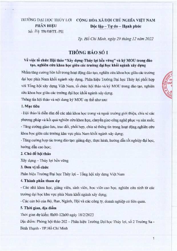 Ban Khoa học công nghệ và Hợp tác quốc tế, Phân hiệu Trường Đại học Thủy Lợi trân trọng gửi đến Quý thầy, cô giảng viên, các nhà khoa học và những người quan tâm thông báo số 114TB/ĐHTL-PH về việc tổ chức Hội thảo “Xây dựng – Thủy lợi bền vững” và ký MOU trong đào tạo, nghiên cứu khoa học giữa các trường đại học khối ngành xây dựng.