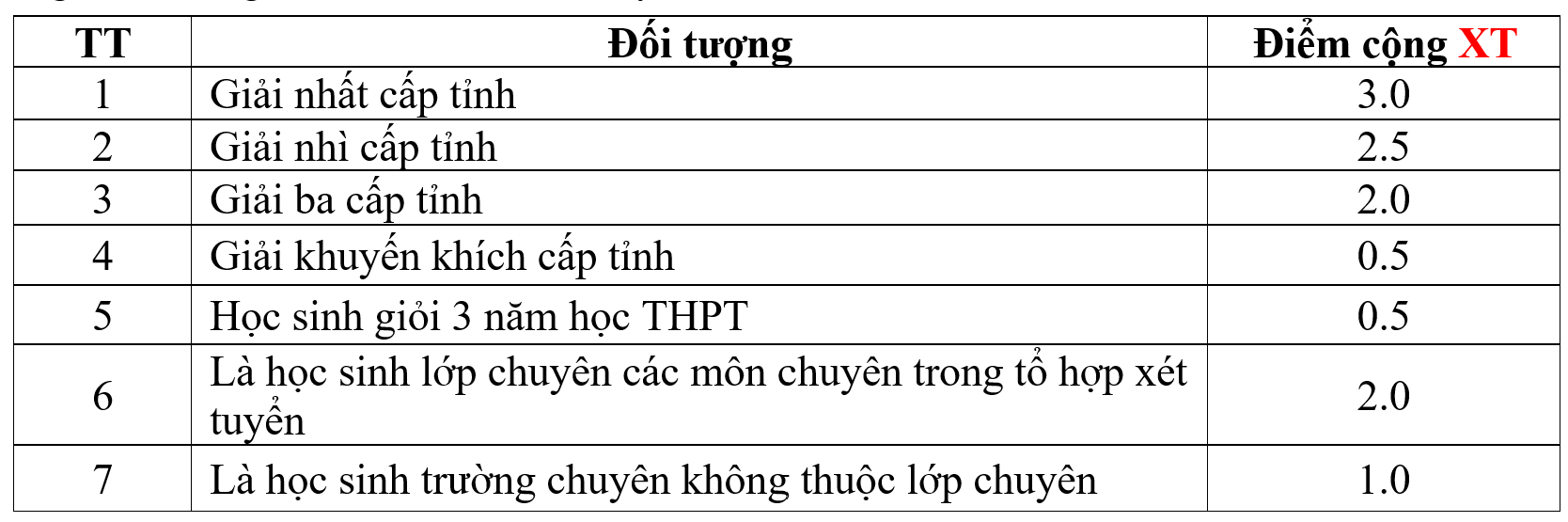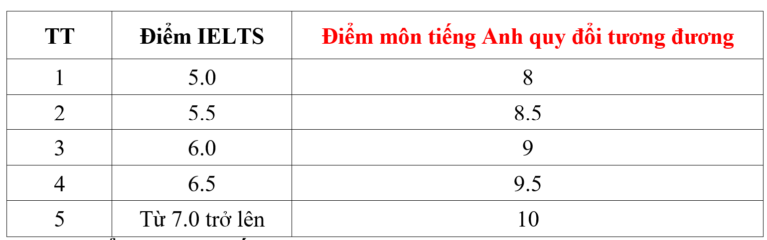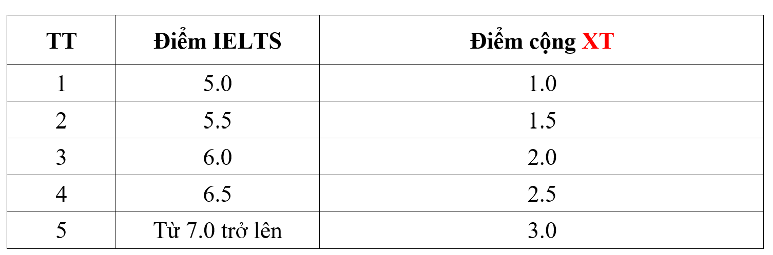 (Các chứng chỉ tiếng Anh quốc tế khác được quy đổi điểm cộng XT tương đương thang chứng chỉ IELTS)