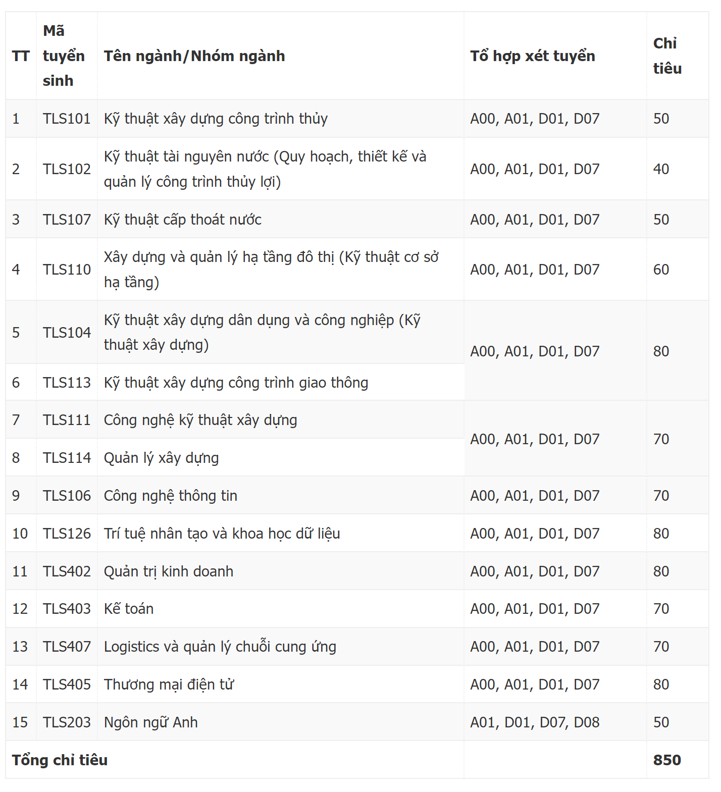 – Tổng chỉ tiêu của Phân hiệu trường Đại học Thủy lợi là 850;