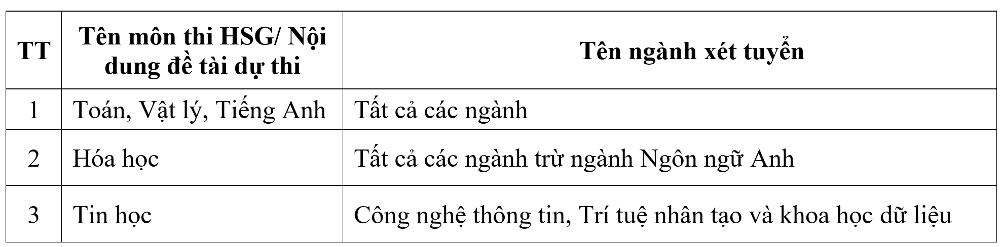 Thí sinh đoạt giải nhất, nhì, ba trong kỳ thi chọn học sinh giỏi quốc gia, quốc tế hoặc thi khoa học, kỹ thuật cấp quốc gia, quốc tế do Bộ Giáo dục và Đào tạo (GD&ĐT) tổ chức, cử tham gia; thời gian đoạt giải không quá 3 năm tính tới thời điểm xét tuyển thẳng đã tốt nghiệp THPT được xét tuyển thẳng vào trường theo ngành phù hợp với môn thi. Cụ thể như sau: