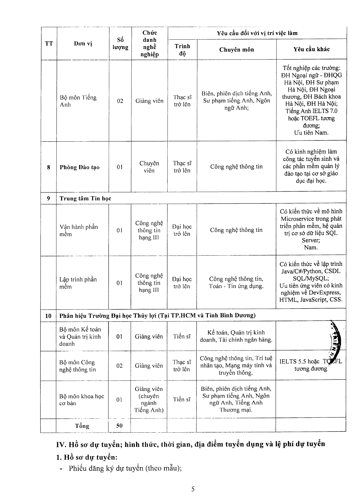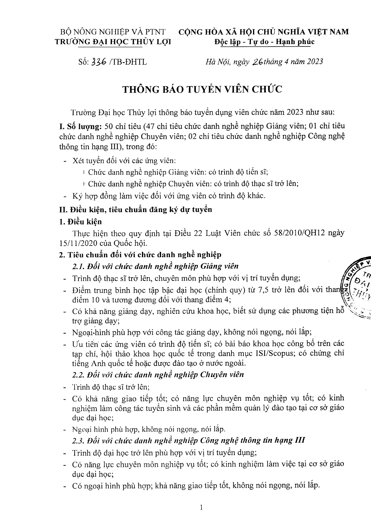 Thực hiện Kế hoạch tuyển dụng viên chức đợt năm 2023, ngày 26/4/2023, Hiệu trưởng đã ký duyệt Thông báo số 336/TB-ĐHTL về tuyển dụng viên chức chi tiết như sau: