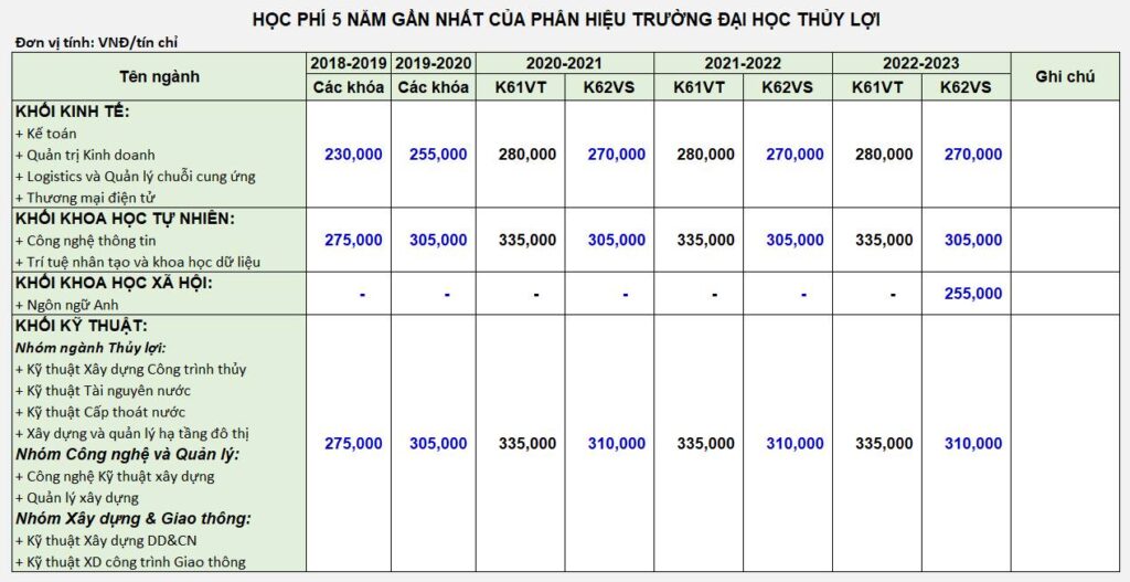 2. Học phí tại Phân hiệu Trường Đại học Thủy lợi