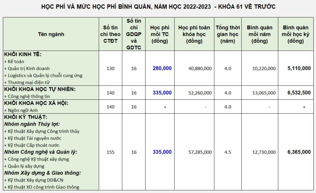 Khóa 61 trở về trước với chương trình khung 145 tín chỉ, thêm 16 tín chỉ QP, TD là 161 tín chỉ, mức thu học phí theo QĐ là 335k/TC. Với cách tính như trên thì học phí toàn khóa là 53.935.000Đ, bình quân năm là 11,986 triệu/năm.