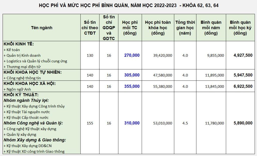 Khóa 62, 63, 64: theo chương trình đào tạo là 130 tín chỉ, thêm 11 tín chỉ GDQP, 5 tín chỉ GDTC, tổng số là 146 tín chỉ. Với mức thu 270k/tc thì tổng số học phí phải đóng cho toàn khóa học là 39.420.000Đ. Với thời gian đào tạo 4 năm thì bình quân năm là 9,855 triệu/năm.