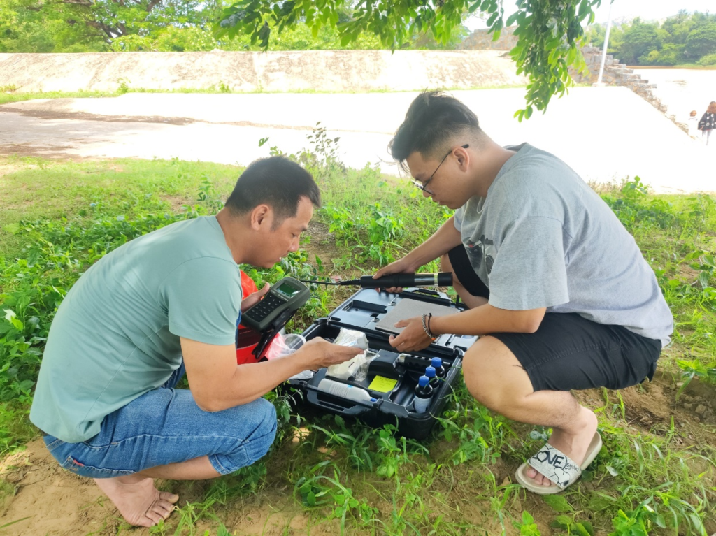 Giảng viên giải thích và hướng dẫn sinh viên sử dụng các thiết bị đo đạc chất lượng nước ngoài hiện trường
