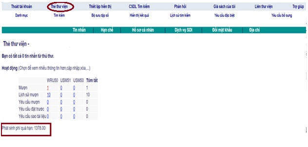 Lưu ý: Khi nhìn thấy dòng chữ phát sinh phí quá hạn có nghĩa là sách của bạn mượn tại Thư viện đã quá hạn trả (mượn quá 150 ngày), khi này bạn cần trả sách quá hạn hoặc lên thư viện gia hạn mượn sách để tránh bị phạt. Con số phát sinh phí quá hạn hiển thị là tổng số ngày quá hạn trả.