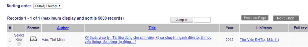Bước 6: Tại cột Title chọn phần nhan đề màu xanh đậm để xem chi tiết thông tin tài liệu.