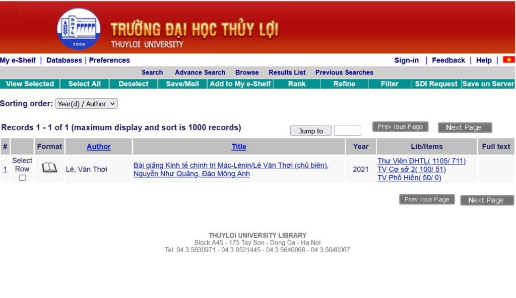 – Bước 1: Truy cập trang http://catalog.tlu.edu.vn/