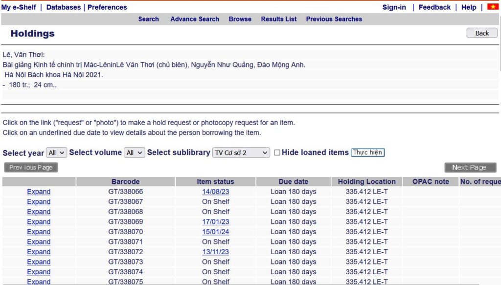 Trong phần Lib/Items sẽ hiển thị số lượng sách in trong các kho sách tại Hà Nội, Thư viện cơ sở Phố Hiến, Thư viện Phân hiệu (TV Cơ sở 2). Trạng thái hiển thị là Tổng số sách / Số sách đã cho mượn. Nhờ vậy sinh viên có thể biết chính xác số lượng sách in còn trong thư viện.