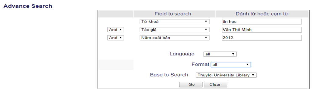 * Ví dụ 2: Tìm cuốn sách về “ Tin học” của tác giả “Văn Thế Minh” xuất bản năm “2012”.