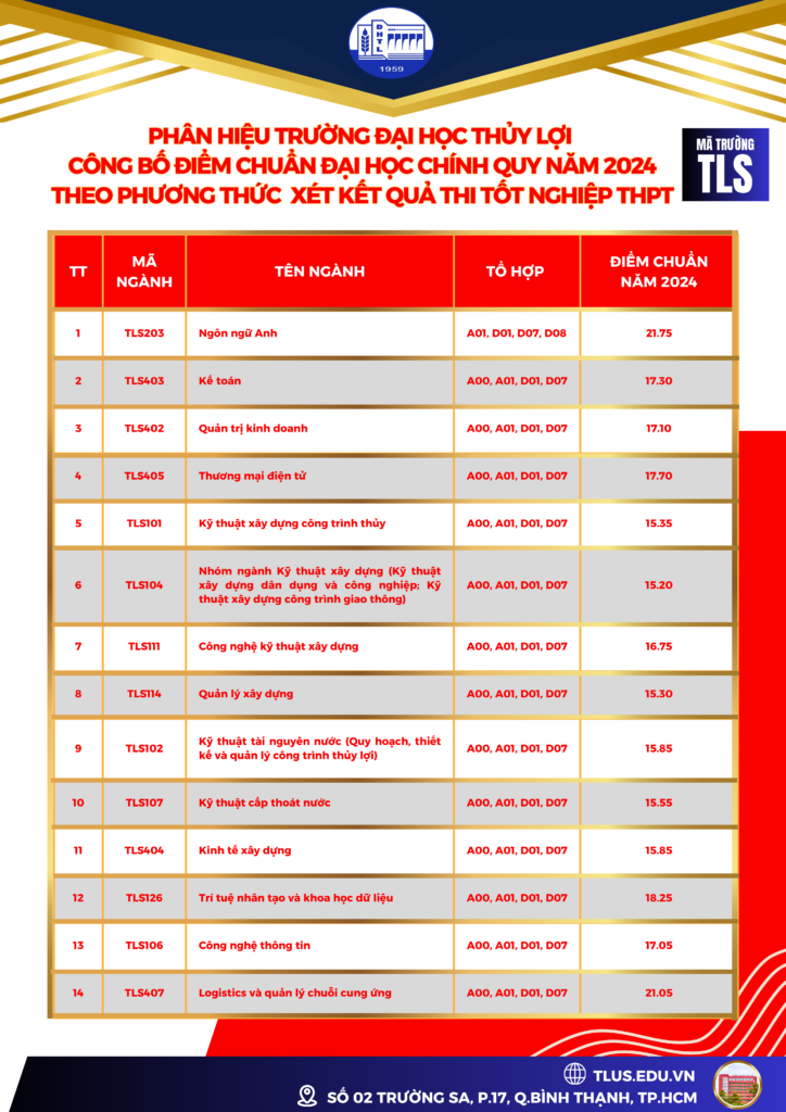 Hội đồng tuyển sinh Phân hiệu Trường Đại học Thủy lợi chính thức công bố điểm chuẩn trúng tuyển đại học chính quy theo phương thức xét tuyển dựa vào kết quả thi tốt nghiệp THPT năm 2024.
