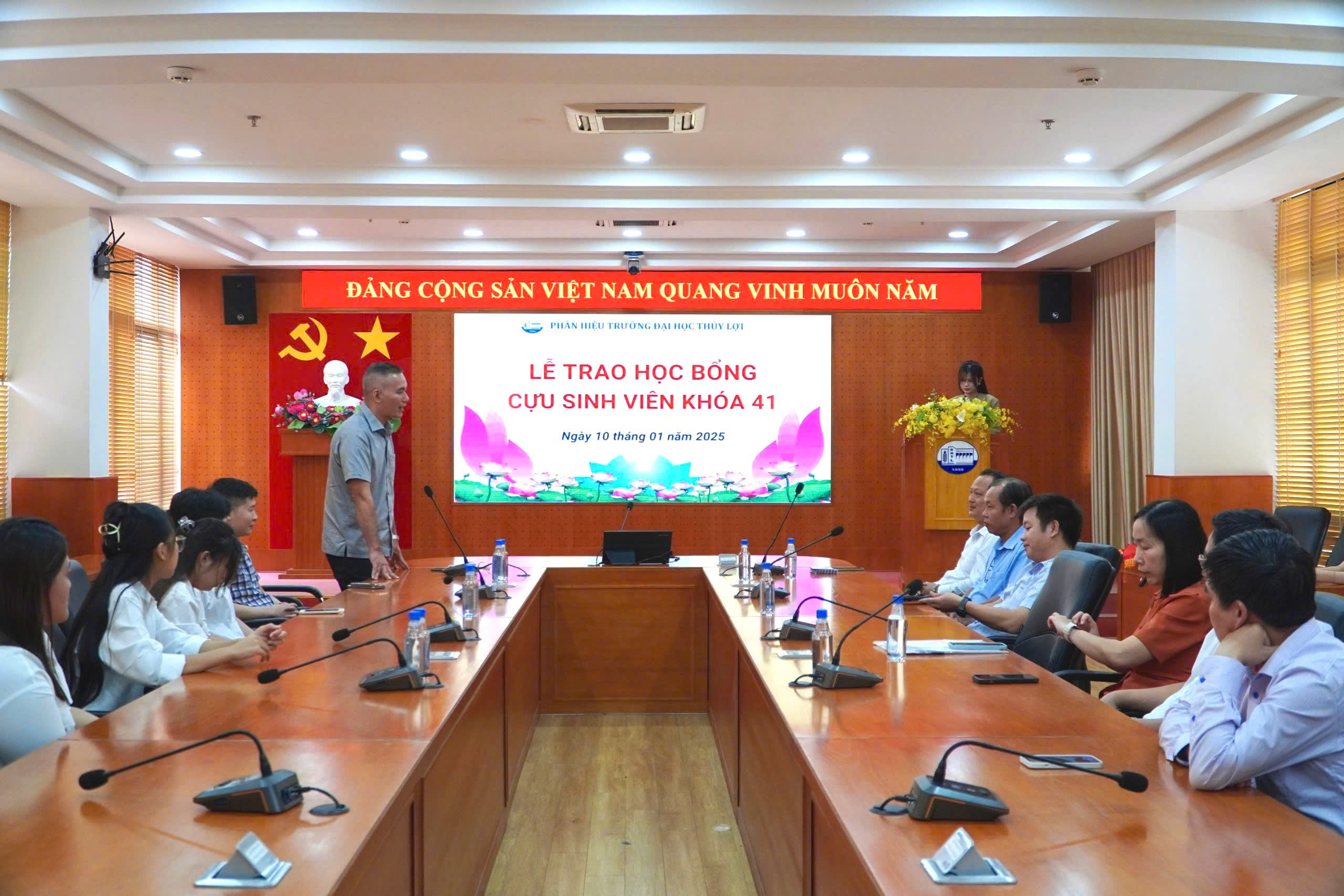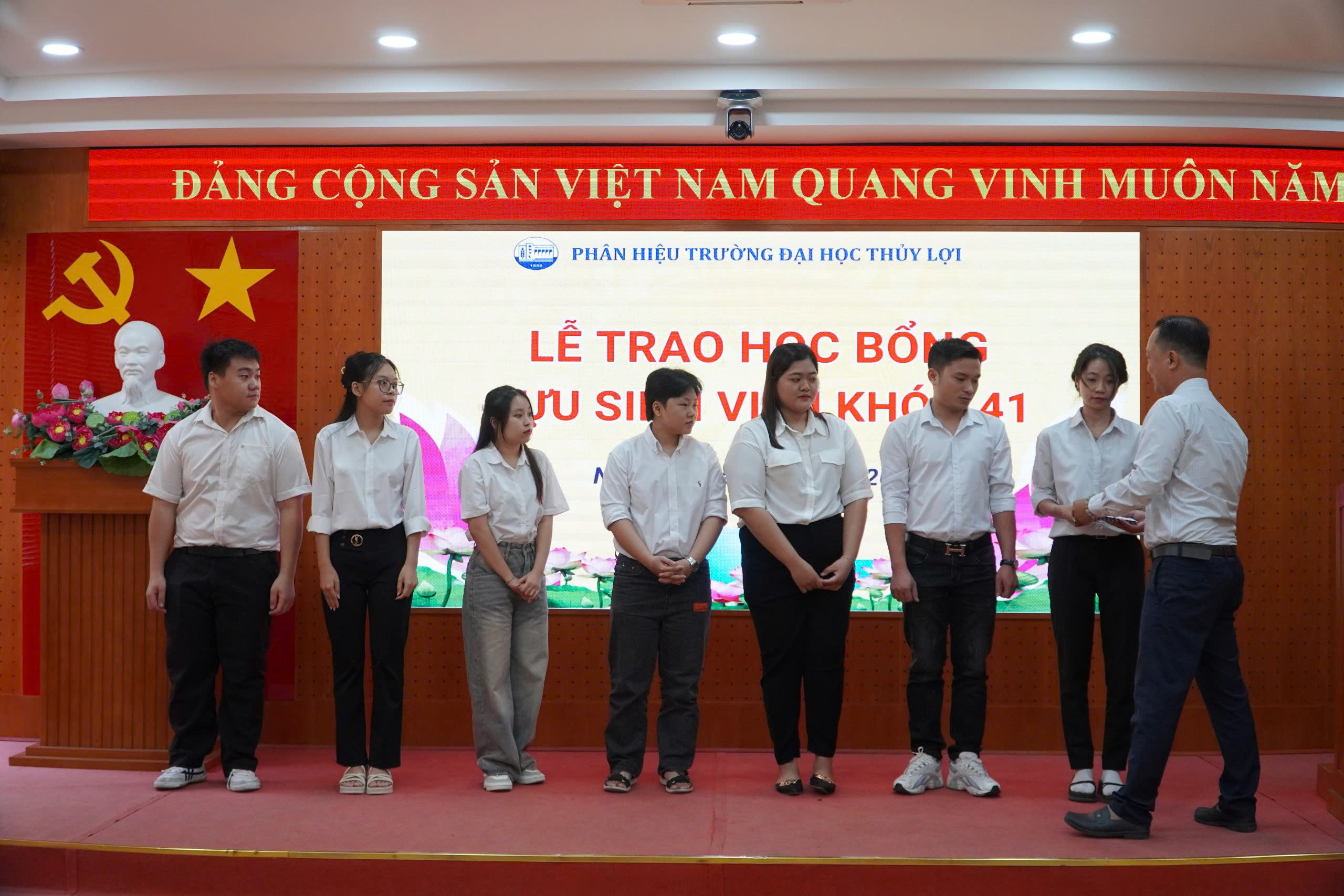 Buổi lễ trao học bổng do cựu sinh viên Khóa 41 đóng góp đã diễn ra trong không khí ấm áp và ý nghĩa, với sự tham dự của nhiều đại biểu quan trọng. Đại diện cựu sinh viên có anh Cao Thanh Huy và chị Nguyễn Ngọc Tân, những người đã dành tâm huyết và tình cảm đặc biệt cho thế hệ sinh viên hiện tại. Về phía Phân hiệu Trường Đại học Thủy lợi, buổi lễ có sự tham gia của PGS.TS Nguyễn Đăng Tính – Phó Giám đốc Phân hiệu; TS. Nguyễn Văn Sơn – Trưởng phòng Truyền thông và Công tác sinh viên; ThS. Lê Trung Thành – Giám đốc Thư viện; ThS. Nguyễn Quang Thịnh – Trưởng phòng Kế hoạch – Tài chính; TS. Phạm Ngọc Thịnh – Trưởng bộ môn Công trình, cùng các thầy cô và 10 sinh viên xuất sắc được nhận học bổng.