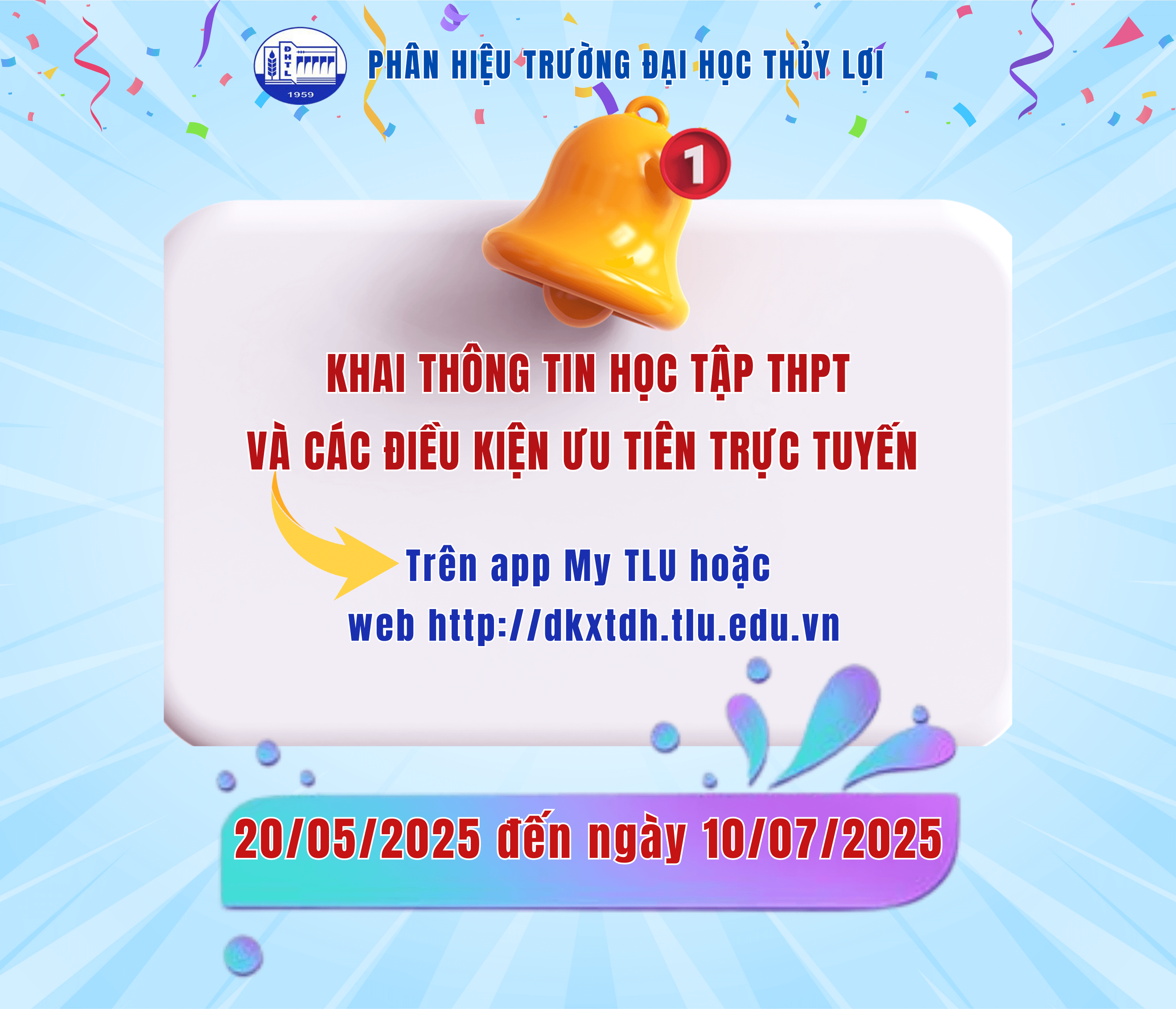 Phân hiệu Trường Đại học Thủy lợi khuyến khích thí sinh chủ động thực hiện khai báo đúng thời hạn để đảm bảo quyền lợi khi xét tuyển. Mọi thông tin chi tiết về điều kiện xét tuyển, hình thức thi tuyển và các đợt tuyển sinh trong năm sẽ được Nhà trường cập nhật thường xuyên trên các kênh thông tin chính thức.