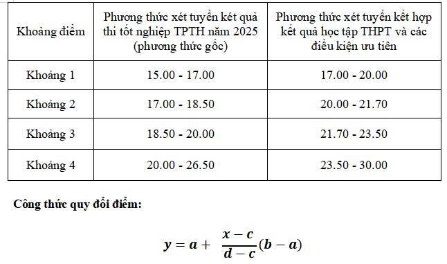 Bảng quy đổi tương đương giữa phương thức xét tuyển kết hợp kết quả học tập THPT và các điều kiện ưu tiên với phương thức xét tuyển kết quả thi tốt nghiệp THPT năm 2025