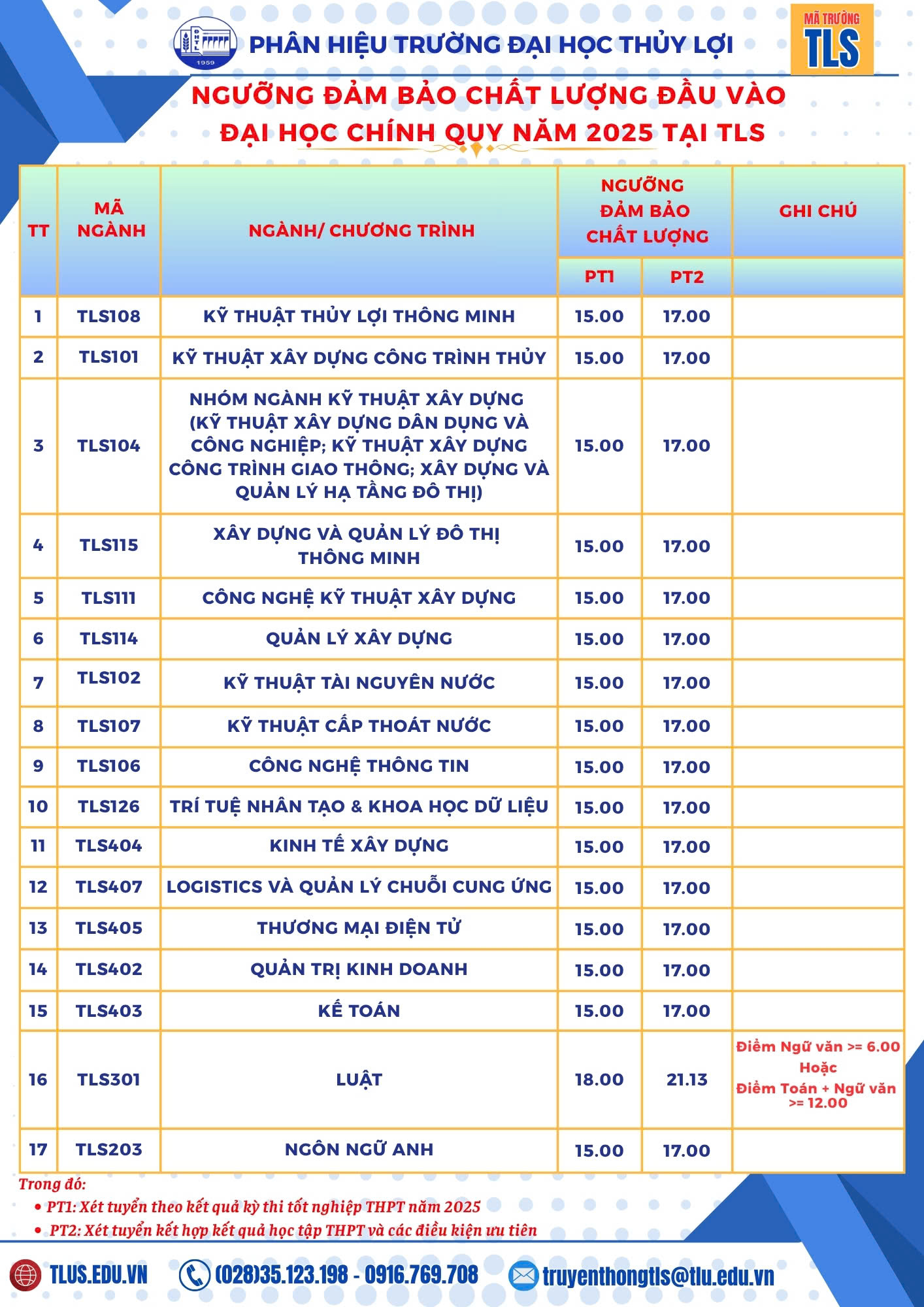 Phân hiệu Trường Đại học Thủy lợi chính thức công bố ngưỡng đảm bảo chất lượng đầu vào đại học chính quy năm 2025 theo 2 phương thức tuyển sinh: